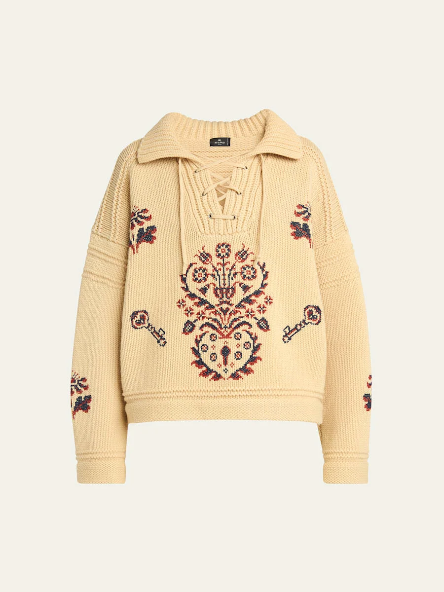Etro sweater in a luxurious wool-cashmere blend Lace-up neckline with spread collar Dropped shoulders Long sleeves Relaxed fit Hem sits at the hip Pullover style Wool/cashmere Professional cleaning recommended Made in Italy Online Inquiries: BGS21_BA71L| Store Inquiries: #5043895