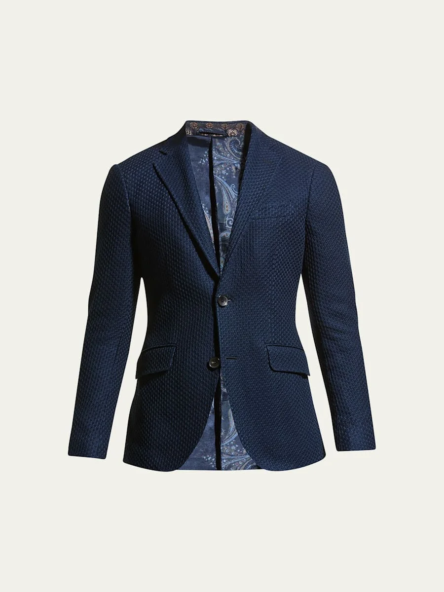 Textured knit blazer by Etro. Notched collar; two-button front. Barchetta chest pocket; flap pockets at waist. Double vent. Finished sleeves. Cotton. Made in Italy. Model is 6'1"/185cm. Online Inquiries: BGS21_N6YG2| Store Inquiries: #3437115