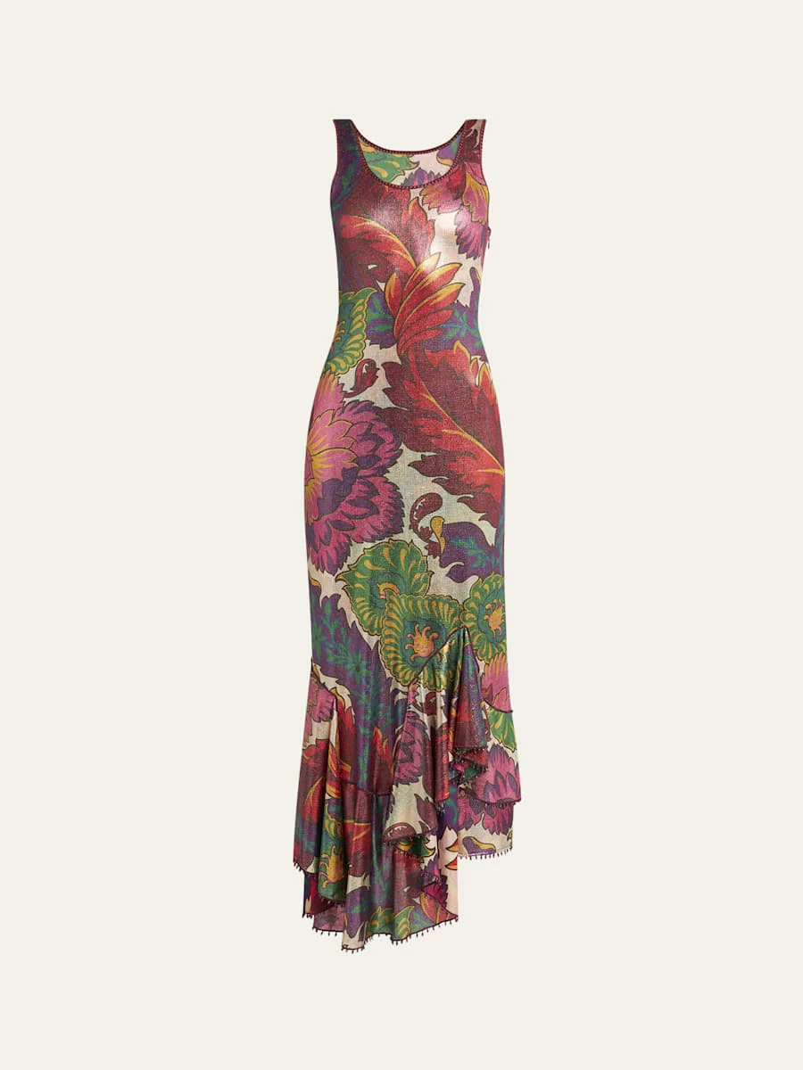 Etro metallic paisley printed dress featuring a back cutout and an asymmetric ruffled hem with beaded trim Scoop neckline Sleeveless Sheath silhouette Full length Invisible side zip Viscose/polyester/elastane Made in Italy Online Inquiries: BGS21_B9XZD| Store Inquiries: #4998226