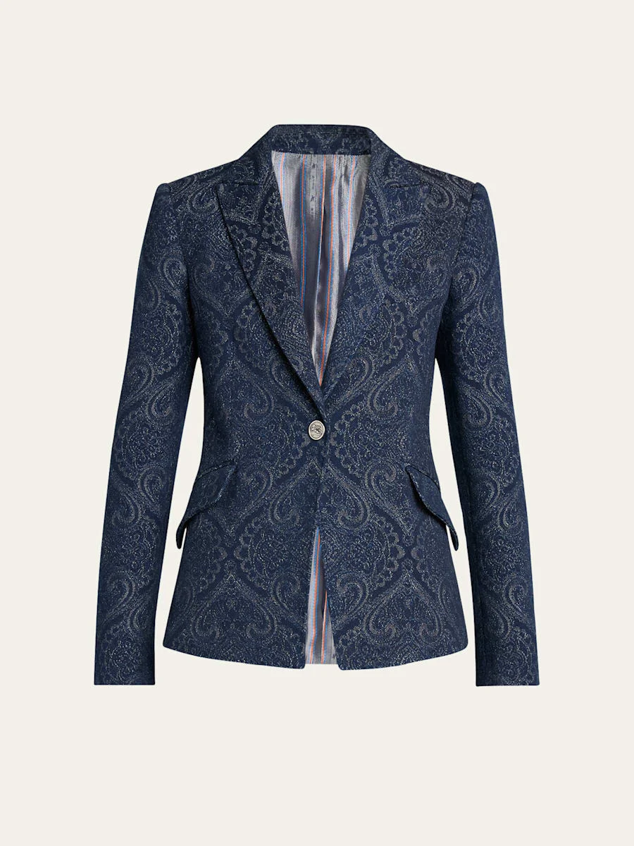 Etro dark-wash denim blazer in an all-over paisley-print Peak lapels Single-breasted front Long sleeves with button cuffs Hip flap pockets Tailored fit Cut-away hem Button-front Cotton/elastane Professional cleaning recommended Made in Italy Online Inquiries: BGS21_BA721| Store Inquiries: #5043910