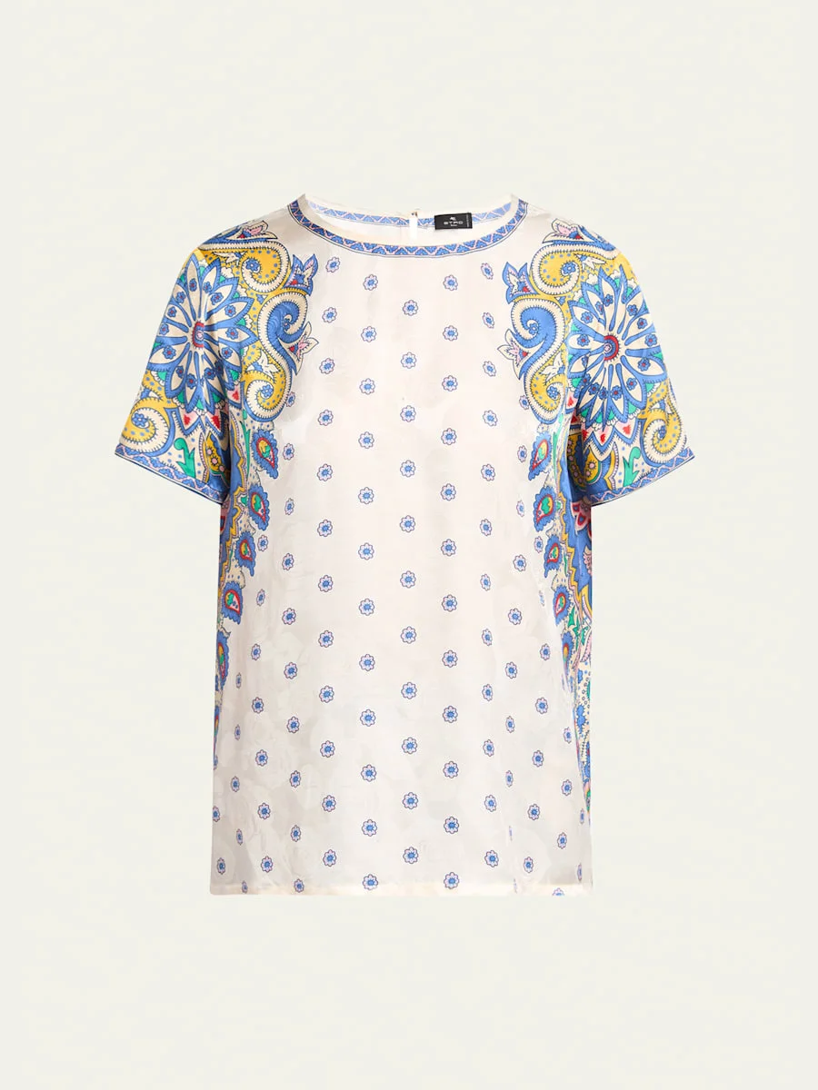Etro top decorated with a faded rose print and a vibrant paisley motif Crew neckline; button/keyhole back Short sleeves Relaxed fit Slip-on style Silk/viscose Professional cleaning recommended Made in Italy Online Inquiries: BGS21_B9QLK| Store Inquiries: #4945651