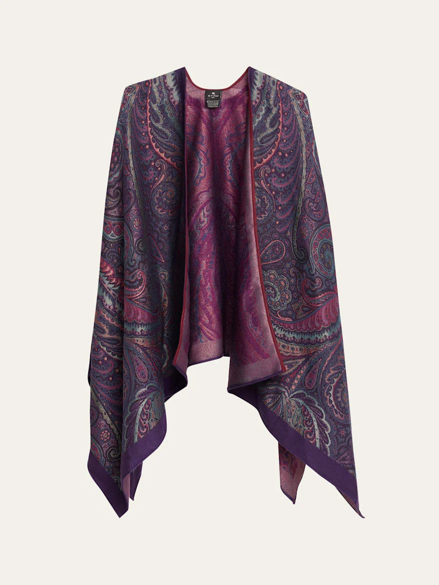 Etro cape features a paisley motif enhanced by luminous Lurex® fibers Open front Cape sleeves Contrasting edges Handkerchief hem Wool/silk/polyester Professional cleaning recommended Made in Italy Online Inquiries: BGS21_D5BFY| Store Inquiries: #5062774