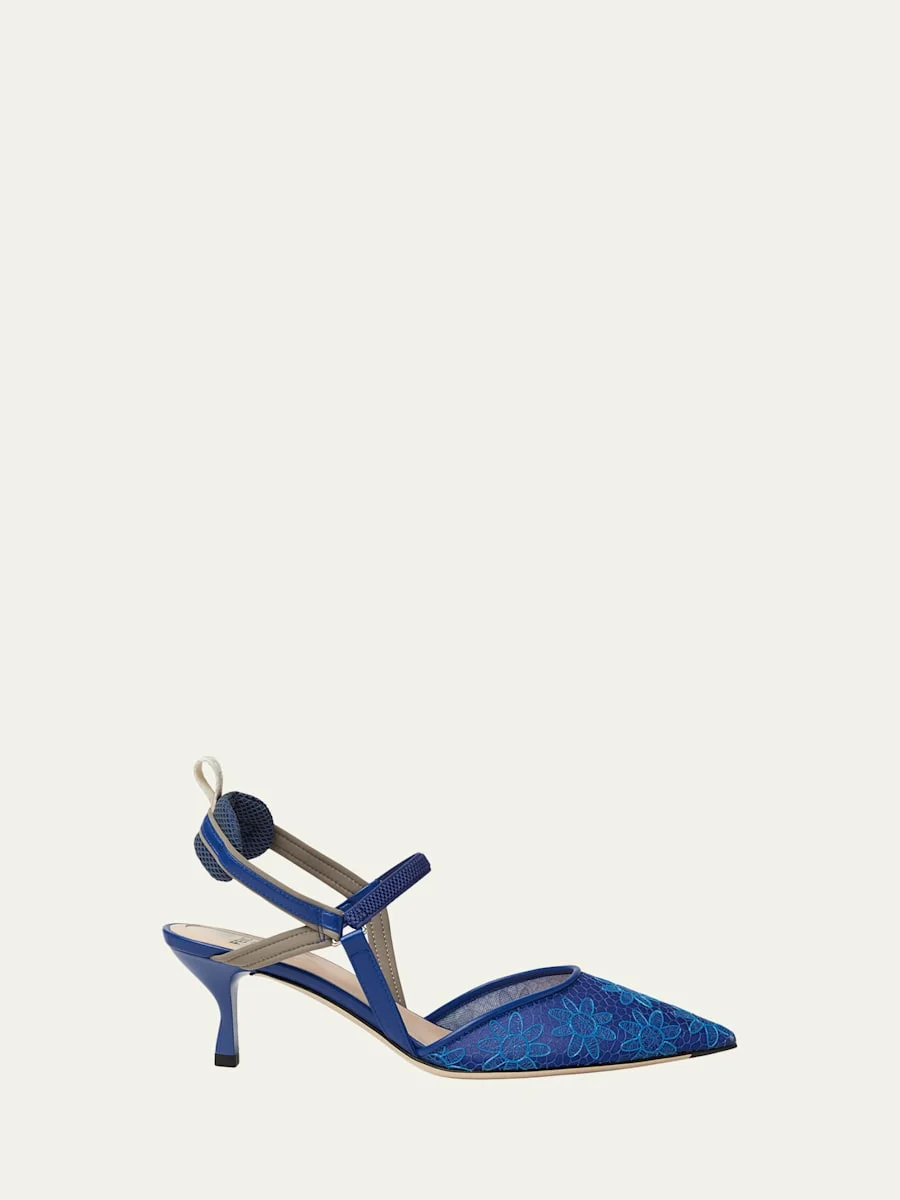 Fendi's "Colibri" pumps are expertly rendered in delicate floral lace, featuring a sheer, feminine texture that is elegantly grounded by smooth leather trims and the house's signature sporty accents 2.25 in / 55 mm kitten heel Pointed toe Padded and pulltab on back collar Slingback ankle strap Leather lining and outsole Made in Italy