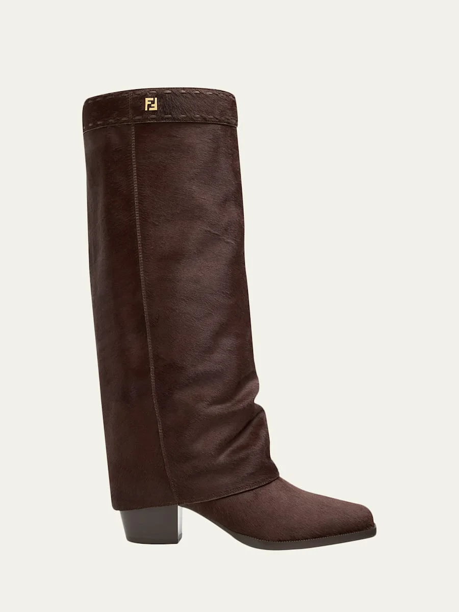 Handmade from dyed calf hair (Italy) with hand-sewn tonal Sellerie topstitching along the collar, these booties by Fendi feature an extended shaft that partially covers the heel, creating a trompe l'oeil pant effect 2.25 in / 55 mm block heel Square toe Golden FF logo at the collar Pull-on style Leather outsole Lining: Elastane/polyacrylic Made in Italy Online Inquiries: BGS21_X6ZNE| Store Inquiries: #5073215