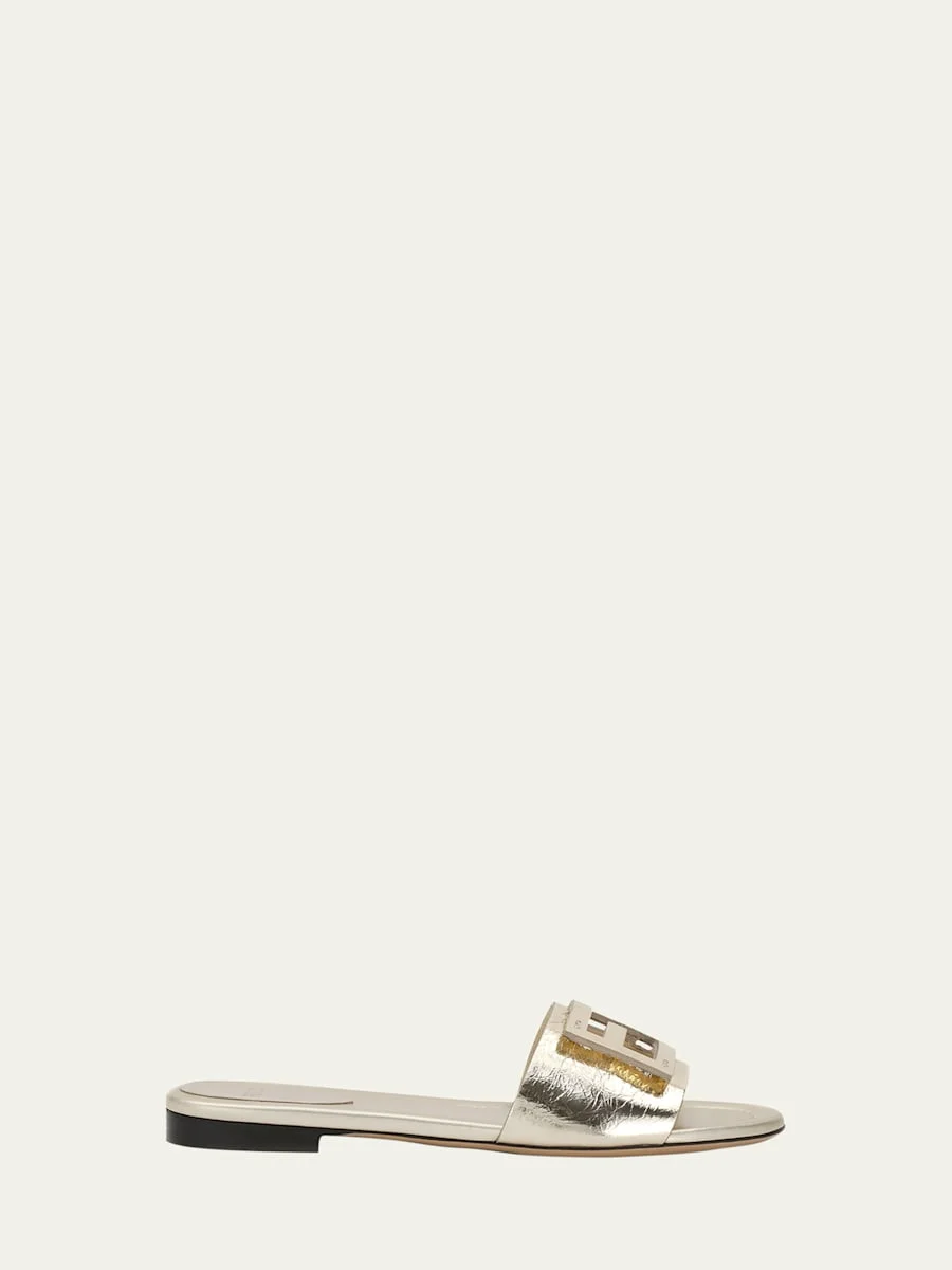 Fendi metallic calf leather sandals with FF medallion Flat heel Open toe Wide band upper Slide style Leather lining Made in Italy