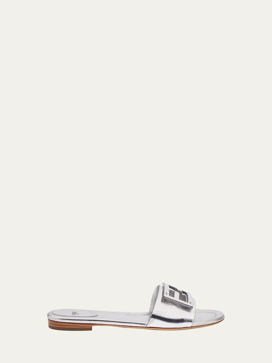 Fendi metallic calf leather sandals with FF medallion Flat heel Open toe Wide band upper Slide style Leather lining Made in Italy Online Inquiries: BGS21_X7DHM| Store Inquiries: #4293376