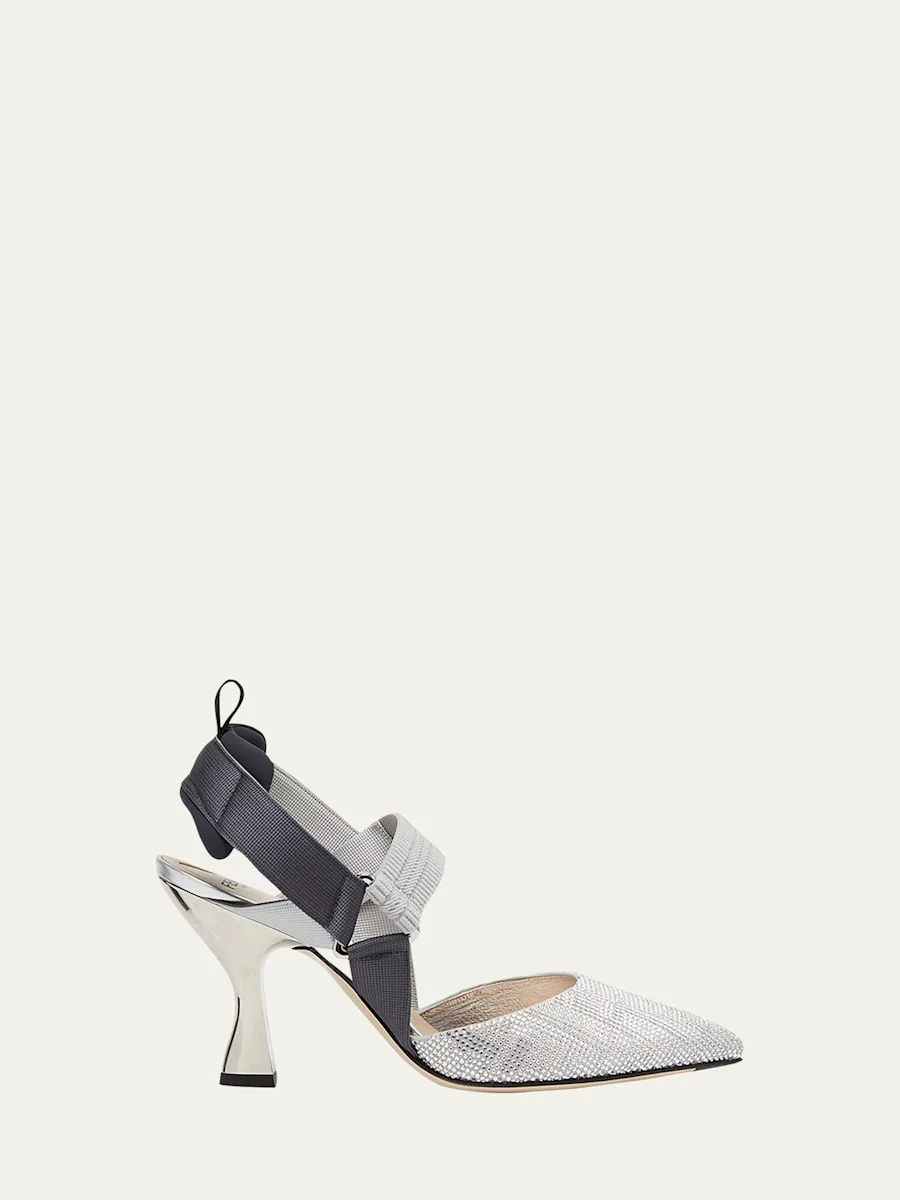 Fendi modern pumps in "FF" crystal-embellished fabric. An unexpected balance of chic and sporty, this pointy-toe slingback pump features grosgrain-ribbon trim. 3.25 in / 85 mm architectural heel. Pointed toe. Stretchy grosgrain strap over instep. Padded slingback strap with pull-loop detail. Leather lining and outsole. "Colibri" is made in Italy. Online Inquiries: BGS21_X6D6T| Store Inquiries: #4676995