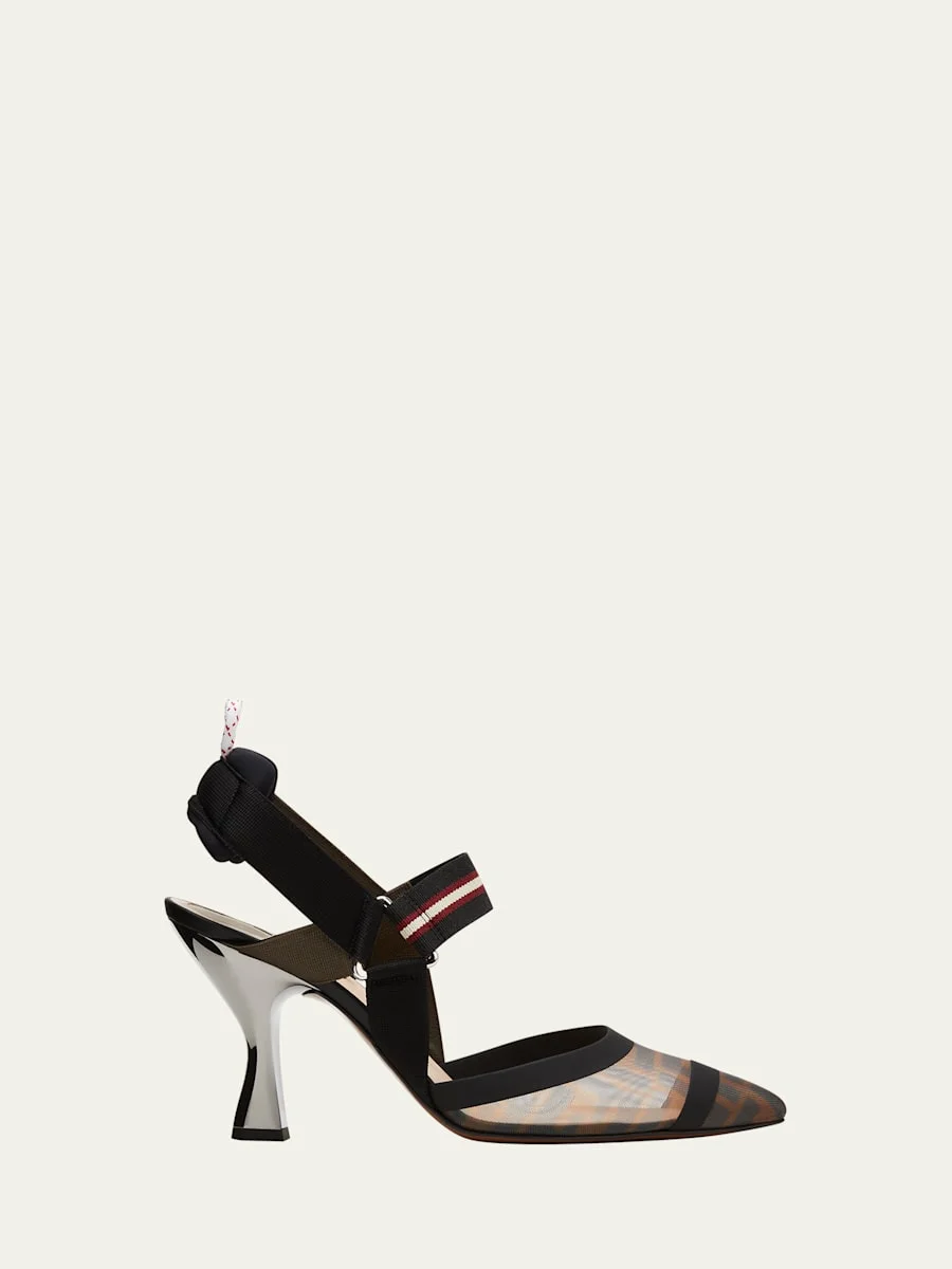 Fendi pumps in fabric, satin and FFembossed mesh. 3.3" metal block heel. Pointed capped toe. Slipon style. Cushioned slingback strap. Pulltab at back. Leather lining. Smooth outsole. "Colibri" is made in Italy.