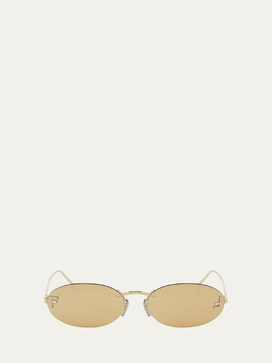 Fendi rimless oval sunglasses in metal with crystal-embellished F accents on frames Lens/bridge/temple (in mm): 54-15-135 Adjustable nose pads Logo engraved on temples Thin, tapered arms 100% UVA/UVB protection Made in Italy Proposition 65 warning for California residents Online Inquiries: BGS21_D4Y2G| Store Inquiries: #4810785