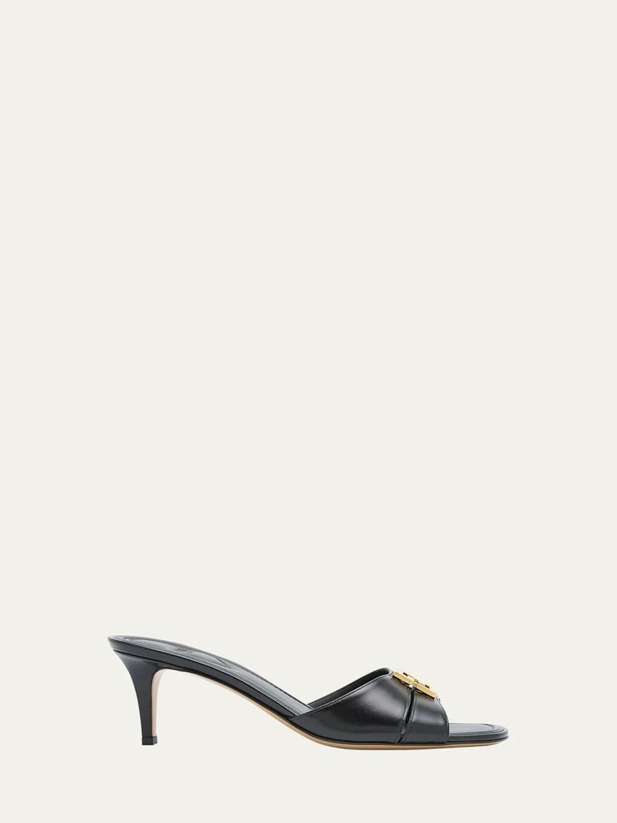 Fendi "Fold" sandals in leather 2.25 in / 55 mm kitten heel Open toe Single band vamp with FF metal accent Slide style Leather outsole Made in Italy Online Inquiries: BGS21_X6JSQ| Store Inquiries: #4745478