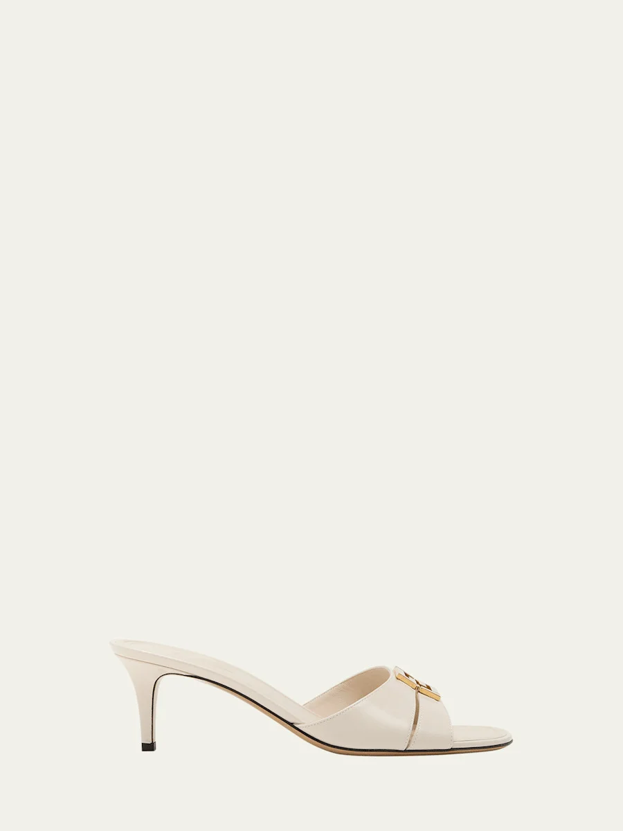 Fendi "Fold" sandals in leather 2.25 in / 55 mm kitten heel Open toe Single band vamp with FF metal accent Slide style Leather outsole Made in Italy Online Inquiries: BGS21_X6JSQ| Store Inquiries: #4745478