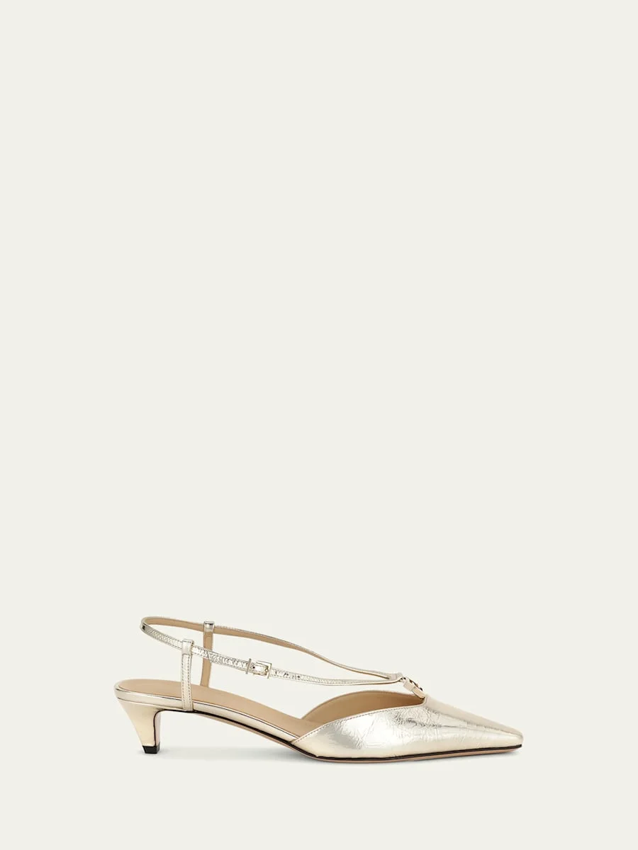 Fendi cracked metallic leather pumps with 4G medallion 1.50 in / 40 mm kitten heel Pointed toe Anchored ankle buckle Leather outsole Lining: Leather Professional cleaning recommended, spot clean Made in Italy Online Inquiries: BGS21_X6S38| Store Inquiries: #4923038