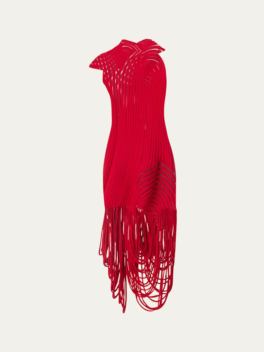 Ferragamo dress with ornate illusion swirl design High neckline Cap sleeve High-low hem Loop hem hits around the knee Bodycon silhouette Viscose/polyester Made in Italy Online Inquiries: BGS21_B9Q1T| Store Inquiries: #4940708