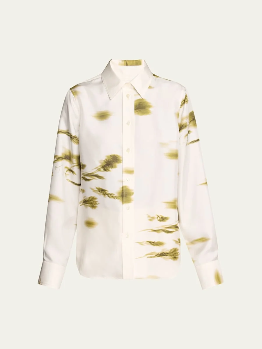 Ferragamo twill blouse in blossom flower Spread collar; button front Long sleeves; button cuffs Back yoke; box pleat Silk Dry clean Made in Italy Online Inquiries: BGS21_B9G9N| Store Inquiries: #4869230