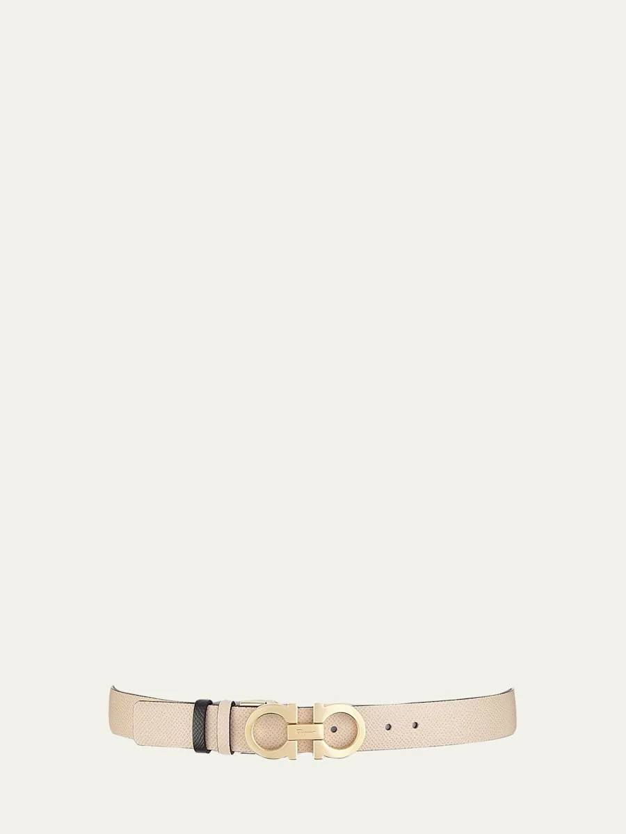 Salvatore Ferragamo belt in embossed leather. Signature double-Gancini buckle with leashed keeper. Reversible to solid black. Silvertone hardware. Approx. 0.98"W. Cut to size. Made in Italy. Online Inquiries: BGS21_D4AHH| Store Inquiries: #2371499