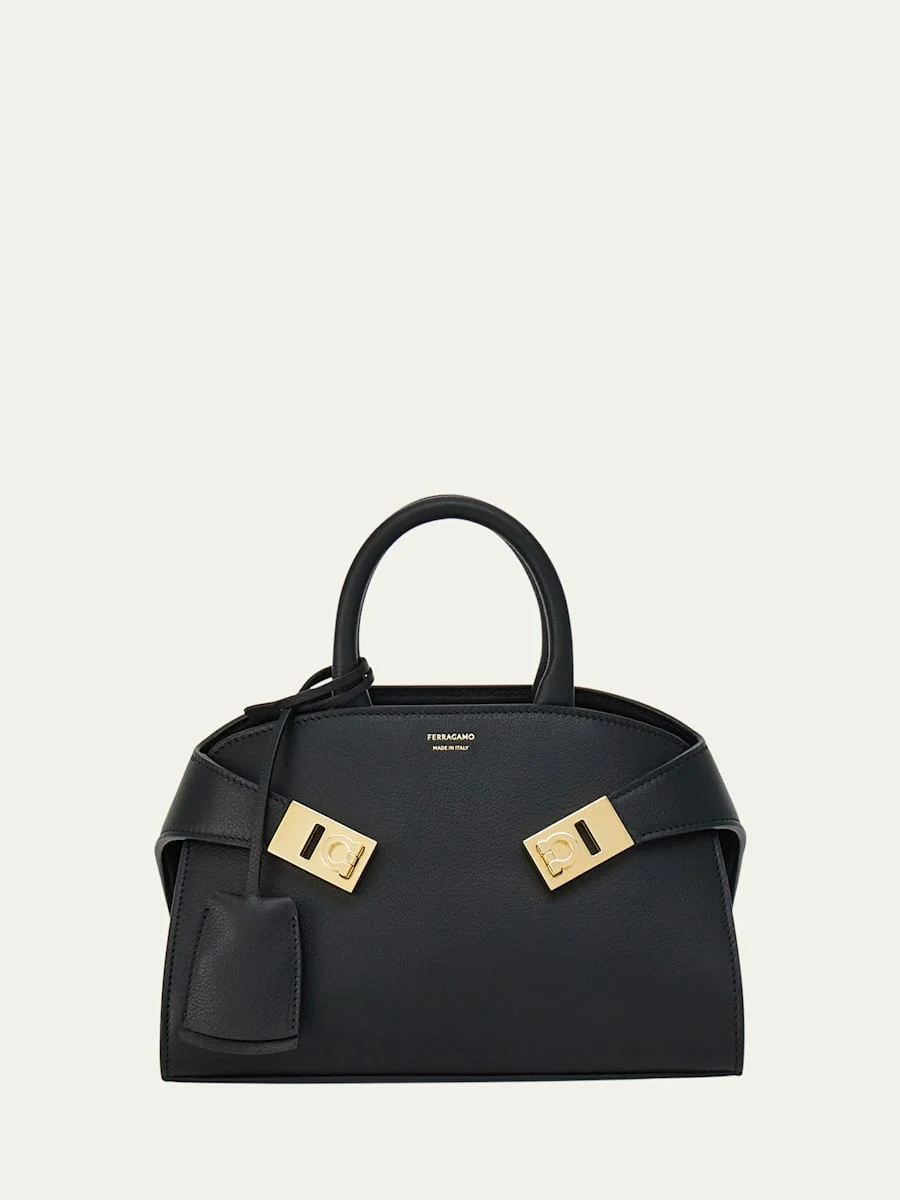 Ferragamo "Hug" top handle bag in soft leather Rolled top handles with keyring tag Detachable, adjustable crossbody strap Can be worn as a top handle or crossbody bag Open top with side Gancini buckles Interior, two card slots Approx. 5.5"H x 8.9"W x 4.3"D Made in Italy Online Inquiries: BGS21_V646X| Store Inquiries: #4706547