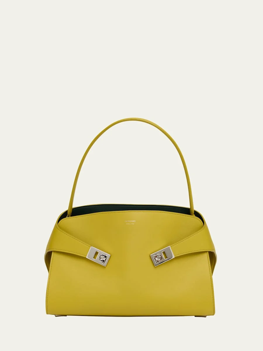 Ferragamo "Hug" shoulder bag in bicolor soft leather Shoulder strap Open top with side Gancini buckles closure Center zip compartment divides interior; two card slots Lining: Leather Feet protect bottom of bag Approx. 10"H x 9.5"W x 6.1"D Made in Italy Online Inquiries: BGS21_V6GT7| Store Inquiries: #4986176