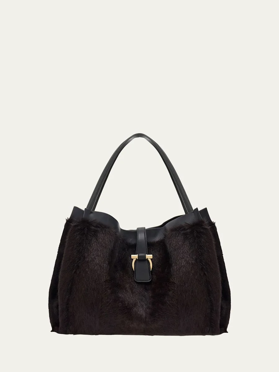 Ferragamo tote bag crafted from dyed minkeffect kid fur (China) with calf leather trim Designed to mimic the shape of the lily, the symbol of the city of Florence. Flat shoulder straps; 9.4" drop Interior, one zip pocket One main compartment Signature Gancio buckle closure Approx. 10.2"H x 15"W x 6.7"D Made in Italy