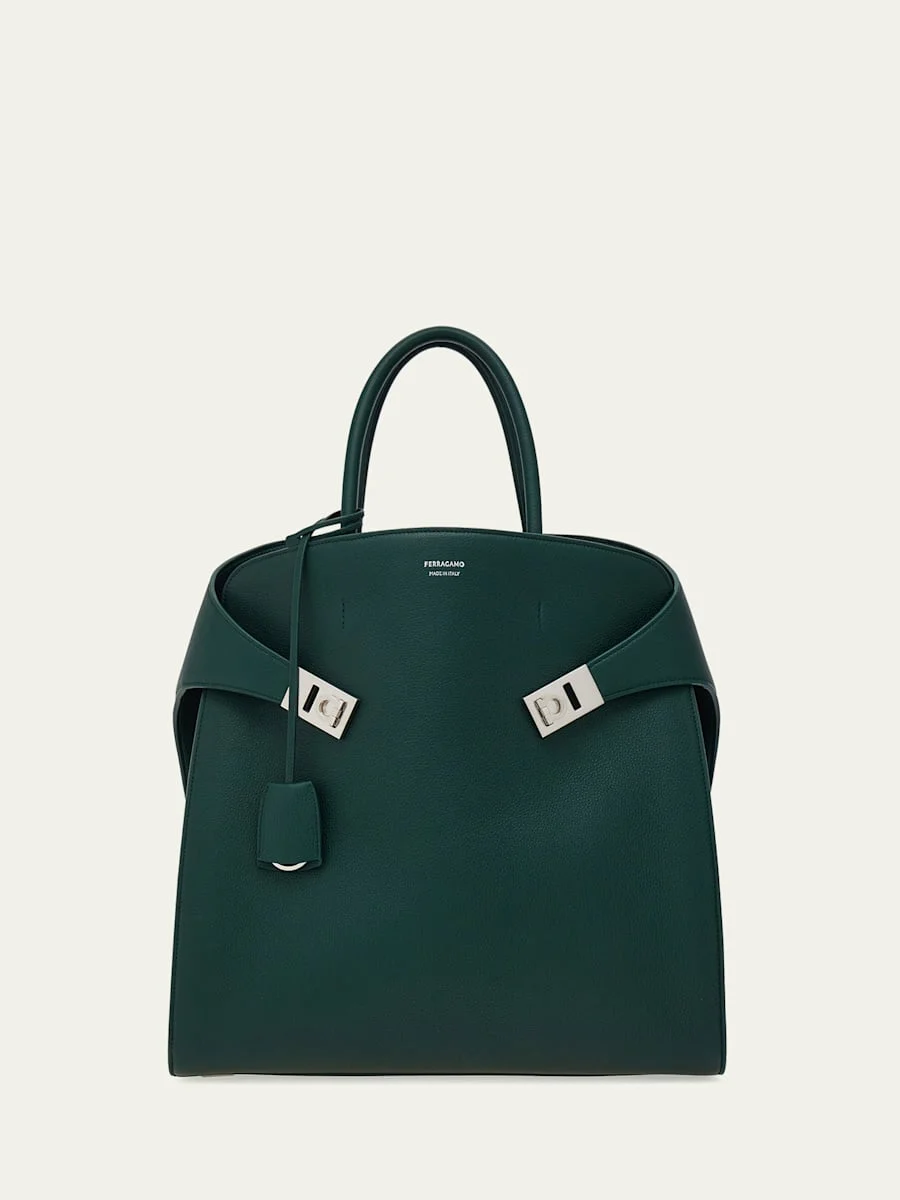 Ferragamo "Hug" tote bag in hammered leather Features an asymmetric back panel that wraps around to ‘hug’ the front via two wide straps with custom Gancini clasps Foiled logo on the front Removable leather shoulder strap Two rolled top handles Interior, one zip pocket Cotton/leather/polyurethane lining Rectangular protective foot studs Silvertone hardware Approx. 15.4"H x 15.0"W x 5.9"D Leather/cotton Made in Italy Online Inquiries: BGS21_NCYFG| Store Inquiries: #4976036