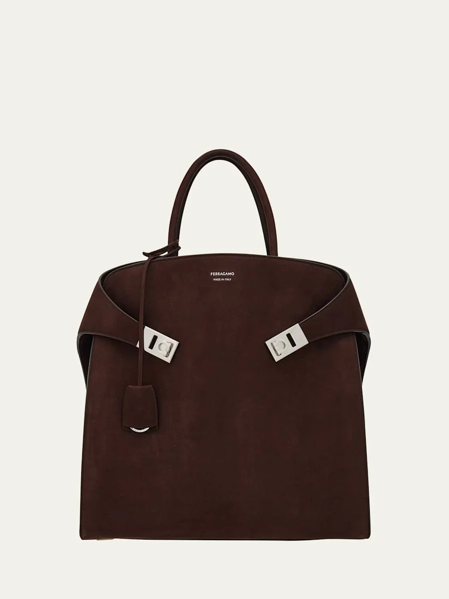 Ferragamo "Hug" tote bag in hammered calf leather Features an asymmetric back panel that wraps around to ‘hug’ the front via two wide straps with custom Gancini clasps Foiled logo on the front Removable leather shoulder strap Two rolled top handles Interior, one zip pocket Cotton/leather/polyurethane lining Rectangular protective foot studs Silvertone hardware Approx. 15.4"H x 15.0"W x 5.9"D Leather/cotton Made in Italy Online Inquiries: BGS21_NCYF8| Store Inquiries: #4976028