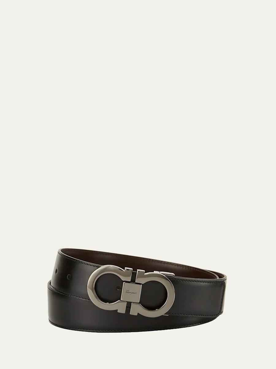Ferragamo reversible belt in calfskin leather. Logo-engraved double Gancio buckle. Belt width: 1.5" (35mm). Size of Buckle: 1.5"W x 3.5"L Versatile styling Professional cleaning recommended Made in Italy. Item runs small, consider sizing up Sizing Note: The adjustable length allows for a more personalized fit and style. Easily cut the belt strap or punch another hole for a tighter or looser fit. Online Inquiries: BGS21_N6RSP| Store Inquiries: #2126742