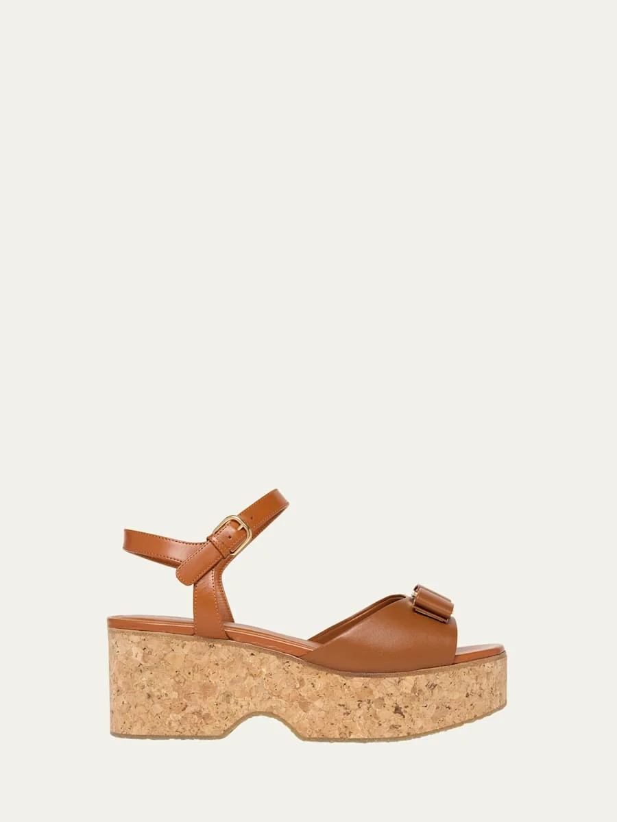 Ferragamo "Selna" smooth leather platform sandals with a logo-engraved bow accent 2.75 in / 70 mm cork wedge heel Open toe Adjustable ankle strap Rubber outsole Lining: Leather Professional cleaning recommended Made in Italy Online Inquiries: BGS21_X6UTW| Store Inquiries: #4981227