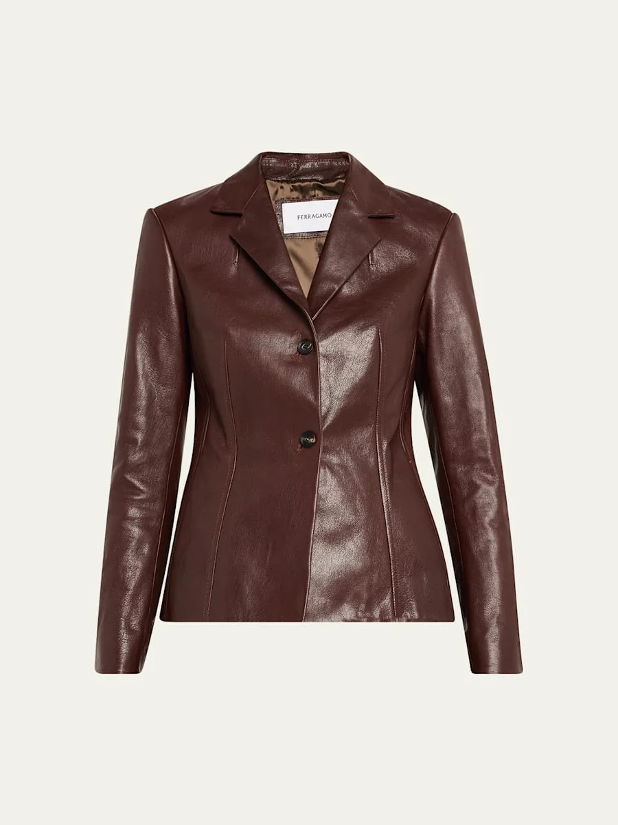 Ferragamo blazer jacket in shiny goat leather Notch lapels; single-breasted front Long sleeves; button cuffs Padded shoulders Slim tailored fit Leather Made in Italy Online Inquiries: BGS21_B9VNP| Store Inquiries: #4983608