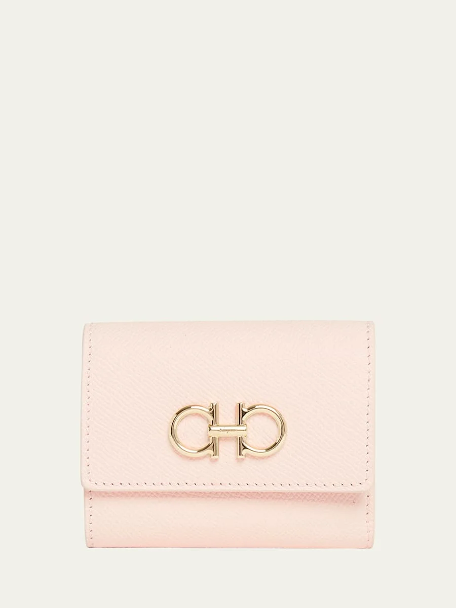 Ferragamo leather wallet with Gancini accent Flap top with snap closure Exterior, back zip pouch Interior, four card slots, one slip pocket Lining: Rayon/leather Approx. 1.2"H x 3.9"W Professional cleaning recommended Made in Italy Online Inquiries: BGS21_D567A| Store Inquiries: #4986170