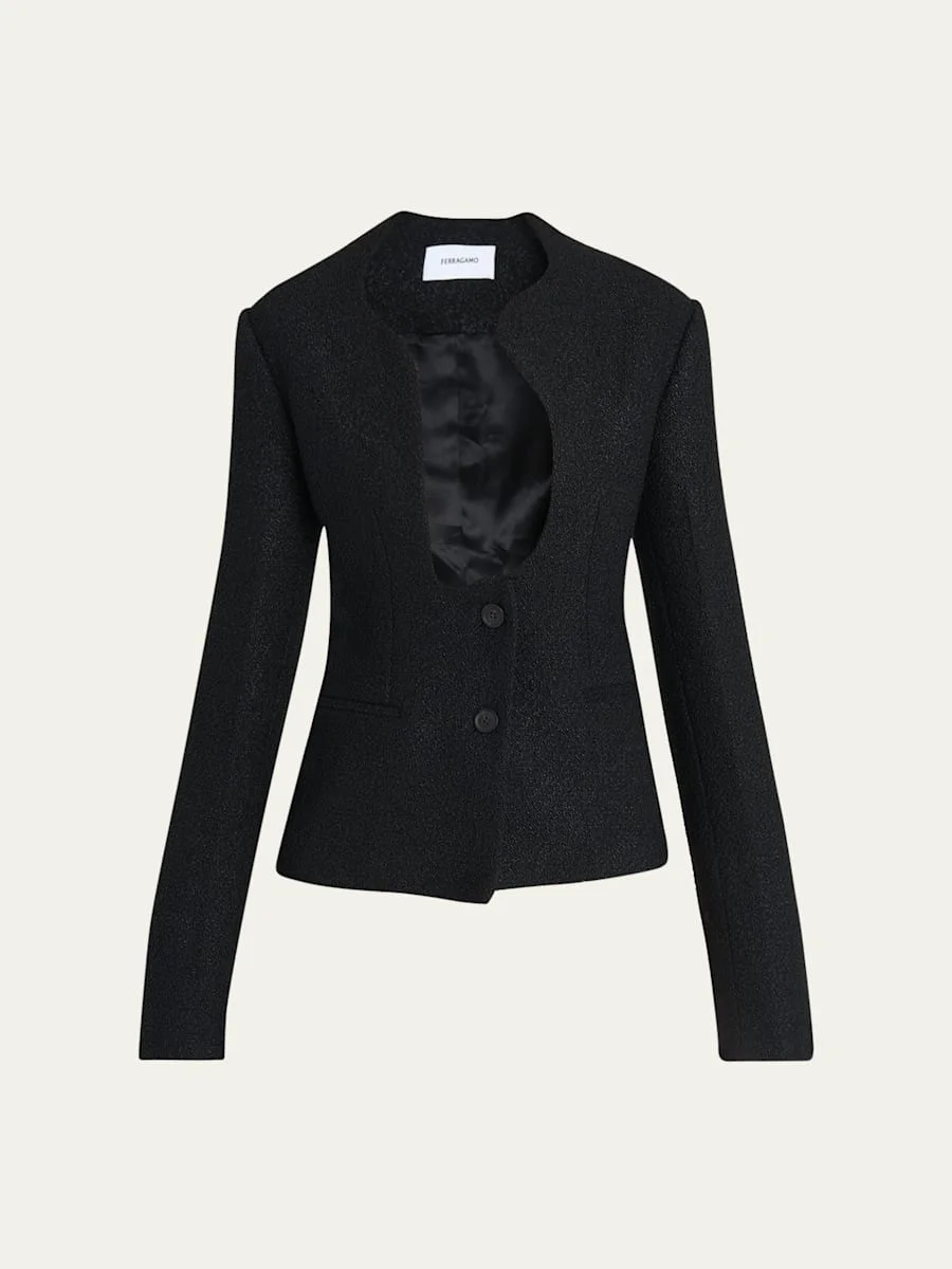 Ferragamo textured blazer Plunge neckline Two-button front Long sleeves Button cuffs Front welt pockets Tailored fit Viscose/nylon/polyamide Made in Italy Online Inquiries: BGS21_B9Q1W| Store Inquiries: #4940711