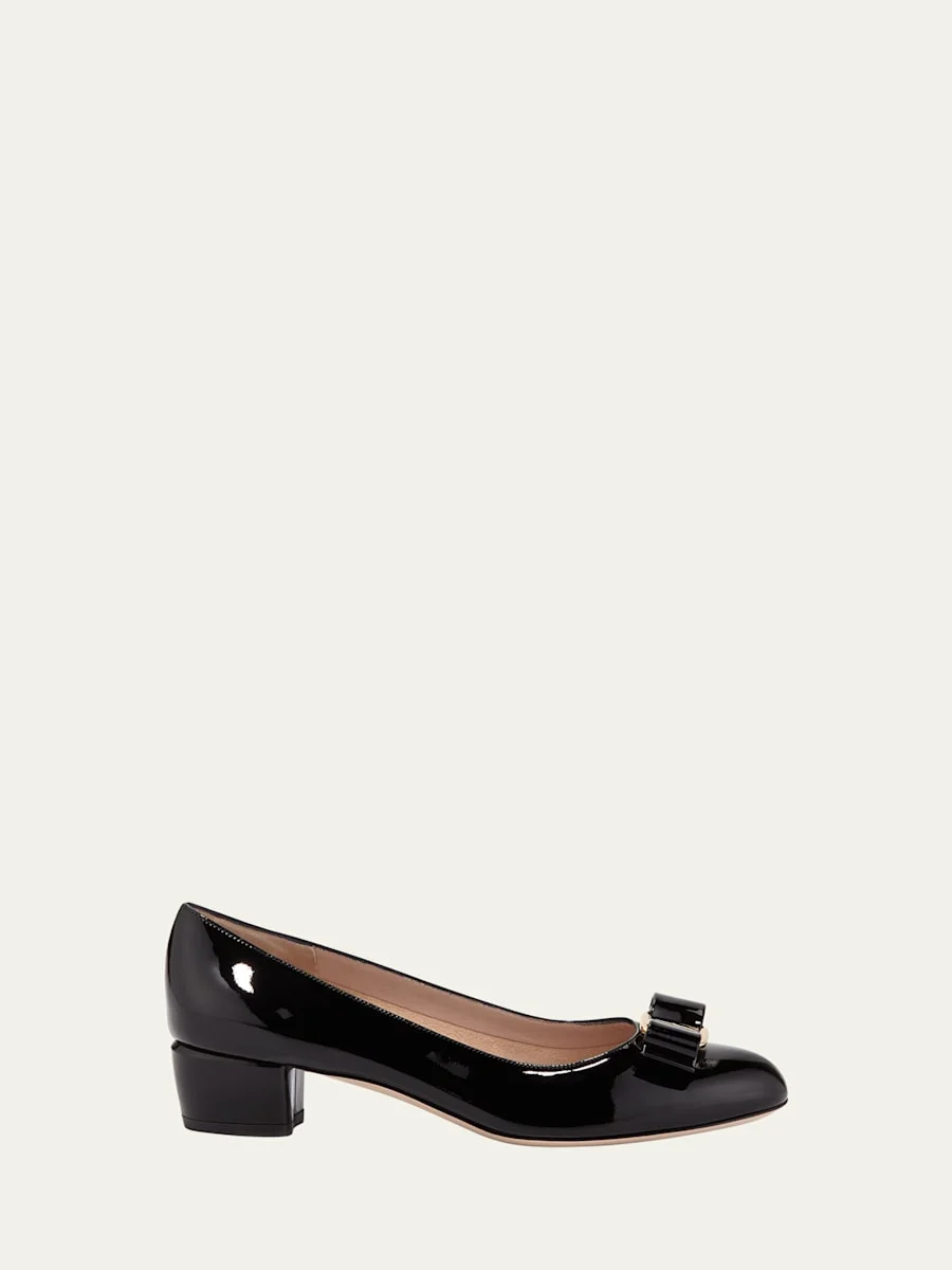 Salvatore Ferragamo "Vara 1" patent leather pump. 1 1/4" covered block heel. Signature Vara patent bow adorns round toe. Golden logo-engraved bow buckle. Leather insole and lining. Leather outsole with rubber heel inset. Made in Italy. Shipping Direct from Vendor, usually ships within 7 business days. Online Inquiries: BGS21_S15Q6| Store Inquiries: #35579