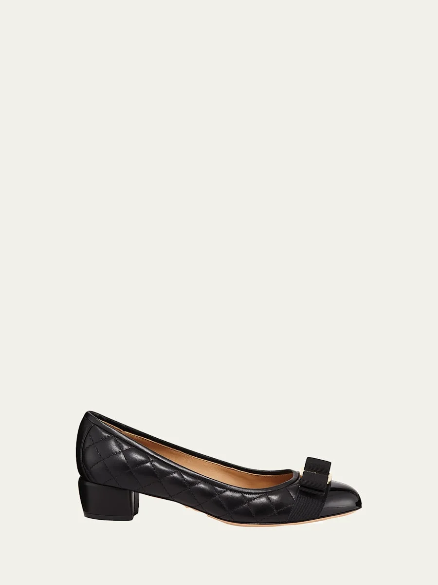 Salvatore Ferragamo "Vara" quilted leather ballerina pumps with grosgrain Vara bow. 1" covered block heel. Round patent cap toe. Slip-on style. Leather lining and sole. Made in Italy. Online Inquiries: BGS21_X47WF| Store Inquiries: #2656529