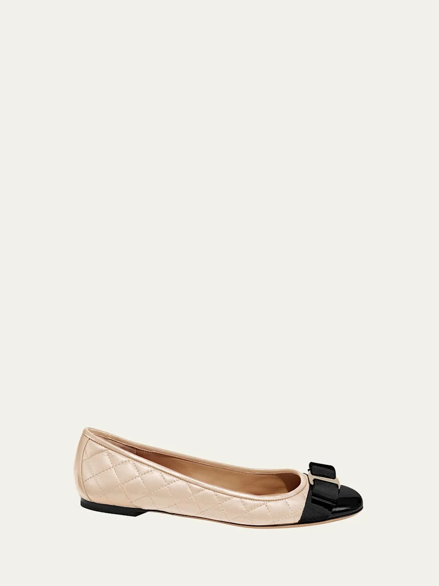Ferragamo "Varina" quilted cotton and patent leather ballerina flats with signature logo-engraved bow accent. 0.3" flat stacked heel. Round cap toe. Slip-on style. Padded leather footbed. Leather lining and sole. Professional cleaning recommended. Made in Italy. Shipping Direct from Vendor, usually ships within 7 business days. Online Inquiries: BGS21_X6J8D| Store Inquiries: #4731862