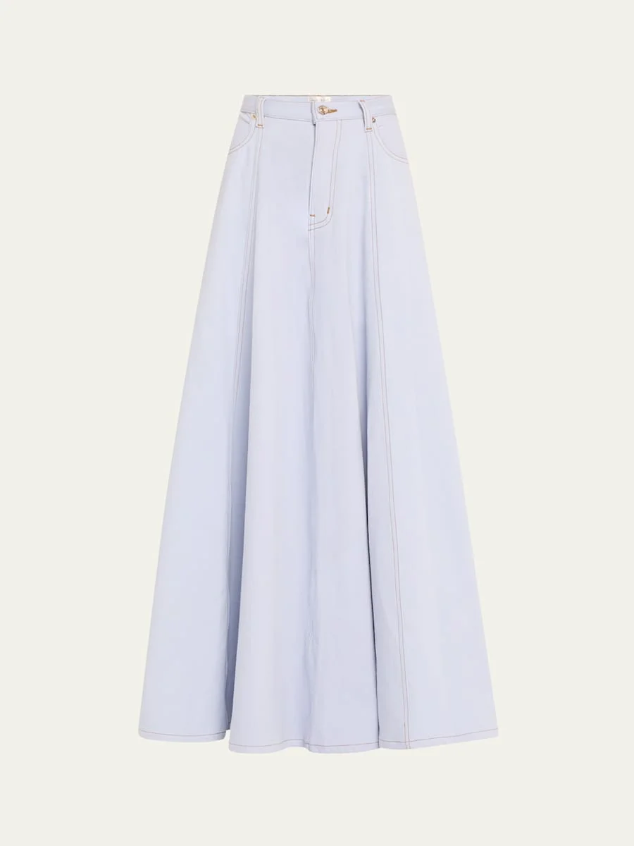 CH x FRAME "The Denim Ball Skirt" in colored denim High rise Front pockets A-line silhouette Full length Button/zip fly; belt loops Cotton Machine wash cold, tumble dry Imported Model is 5'10"/177cm. Online Inquiries: BGS21_T64MD| Store Inquiries: #4901343
