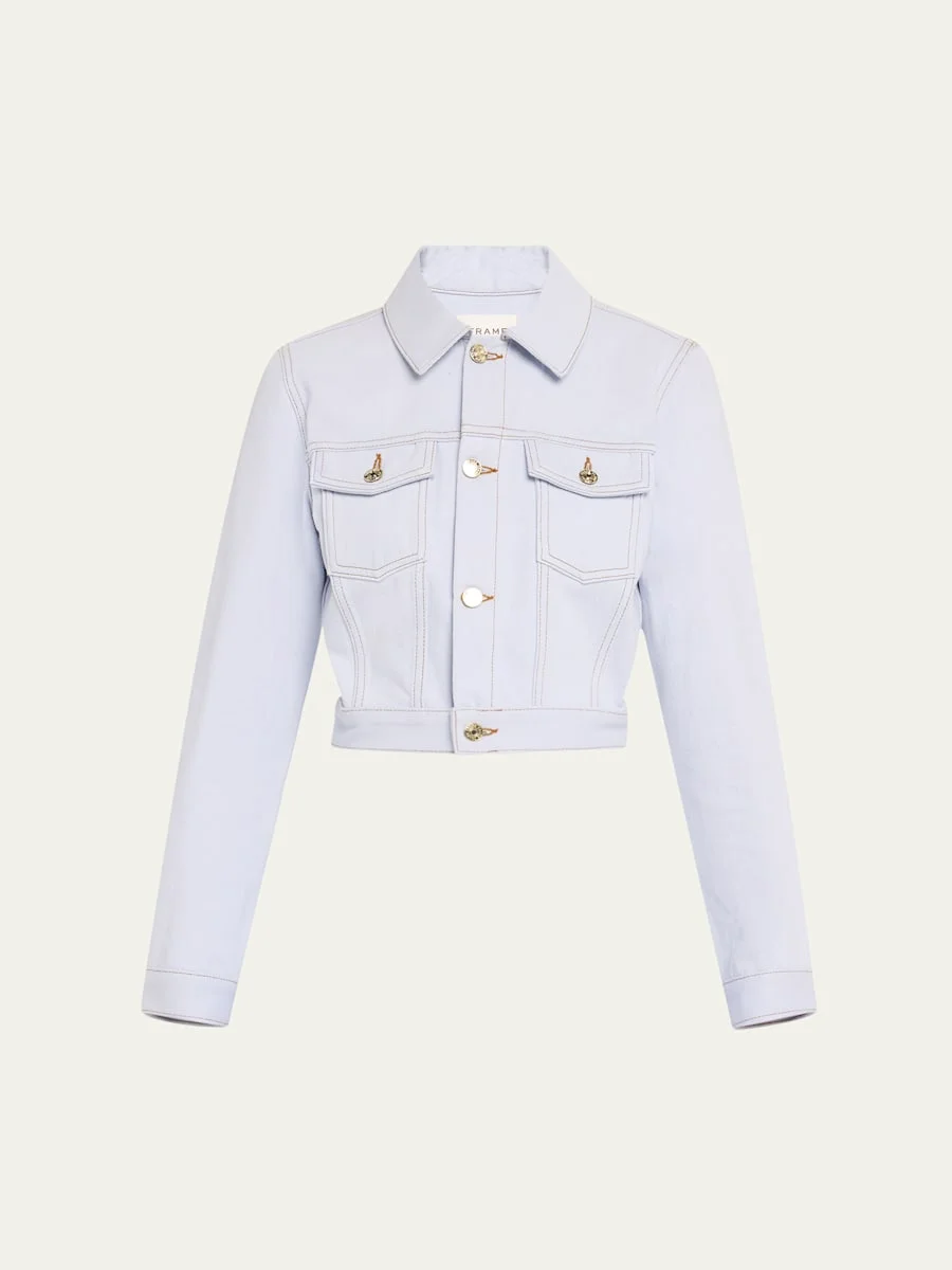 CH x FRAME "The Tailored Denim Jacket " in colored denim Point collar Long sleeves with button cuffs; approx. 18.5"L Dual chest pockets Tailored fit Button-front Cotton Machine wash cold, tumble dry Imported Model is 5'10"/177cm. Online Inquiries: BGS21_T64M9| Store Inquiries: #4901339