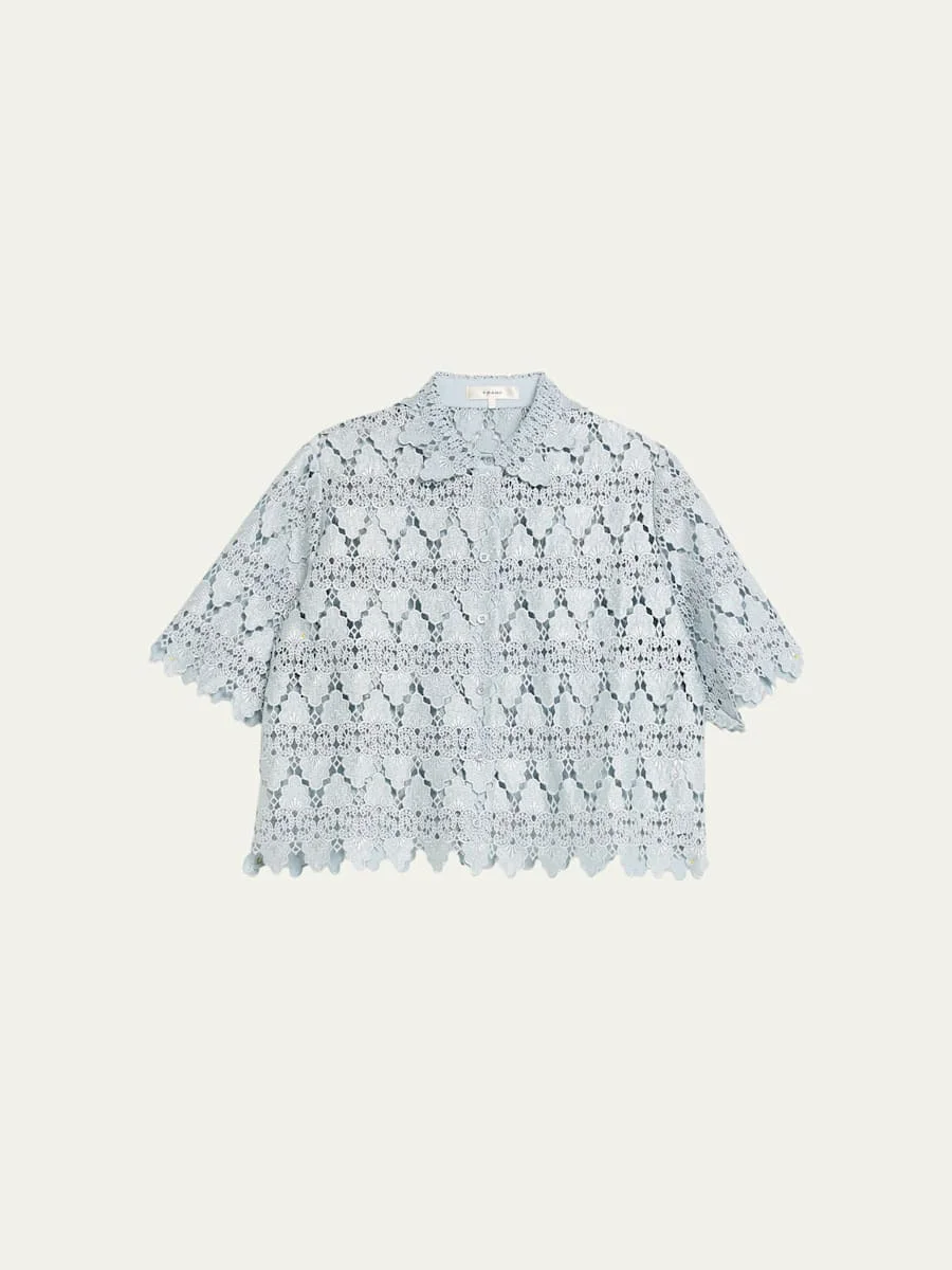 FRAME lace shirt featuring scalloped trim Point collar Short sleeves Classic fit Hem falls to the hip Button-front Polyester Dry clean Imported Online Inquiries: BGS21_T8SHB| Store Inquiries: #4791722