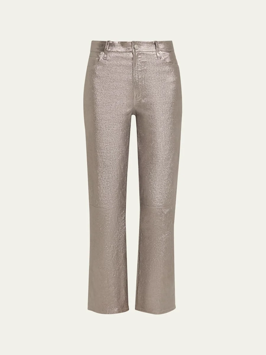 FRAME "Le Sleek Straight" pants crafted from shimmering metallic lambskin leather Approx. 11" rise; 28" inseam High rise Fivepocket style Straight legs Full length Button/zip fly; belt loops Leather Dry clean Imported