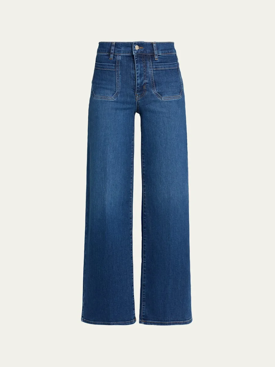 FRAME "Le Slim Palazzo Modernist Pocket" jeans in darkwash stretchdenim Approx. 11" rise; 31" inseam High rise Front and back patch pockets Wide legs with a subtle flare Full length Button/zip fly; belt loops Cotton/polyester/lyocell Machine wash cold Imported