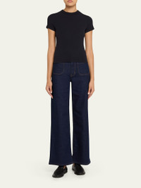 FRAME "Le Slim Palazzo Modernist Pocket" jeans in dark-wash stretch-denim Approx. 11" rise; 31" inseam High rise Front and back patch pockets Wide legs with a subtle flare Full length Button/zip fly; belt loops Cotton/polyester/lyocell Machine wash cold Imported Online Inquiries: BGS21_T6W3N| Store Inquiries: #4974331