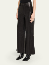 FRAME "Le Slim Palazzo Modernist Pocket" jeans crafted in luxurious lambskin leather. Approx. 11" rise; 31" inseam High rise Front and back patch pockets Wide legs with a subtle flare Full length Button/zip fly; belt loops Leather Leather method dry cleaning Imported Online Inquiries: BGS21_T6W3C| Store Inquiries: #5048139