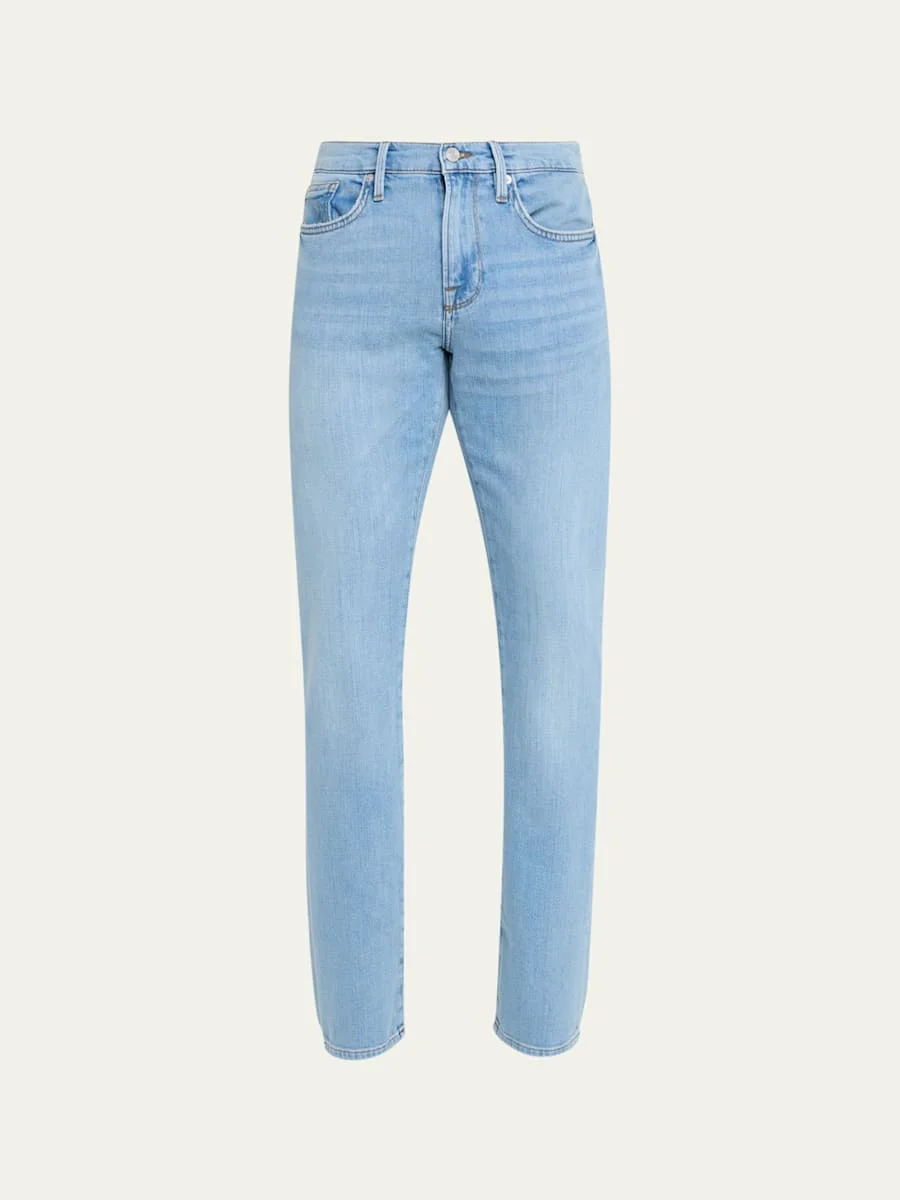 FRAME "L'Homme Slim " jeans with whiskering and fading. Five-pocket style. Mid rise. Slim fit Button/zip fly; belt loops. Cotton/polyester/spandex. Machine wash. Imported Model is 6'1"/185cm. Online Inquiries: BGS21_NBGNL| Store Inquiries: #2145538
