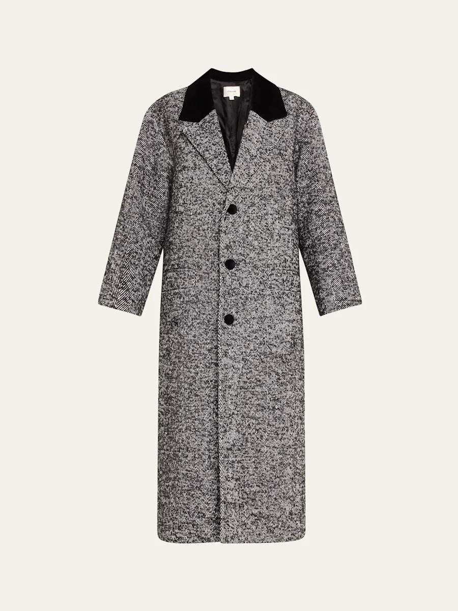 FRAME long wool-blend coat featuring a herringbone motif Notched lapels Single-breasted front Dropped shoulders Long sleeves Hip pockets Relaxed fit Hem falls below the knee Button-front Cotton/polyester/wool Imported Model is 5'10"/177cm. Online Inquiries: BGS21_T61P6| Store Inquiries: #4883598