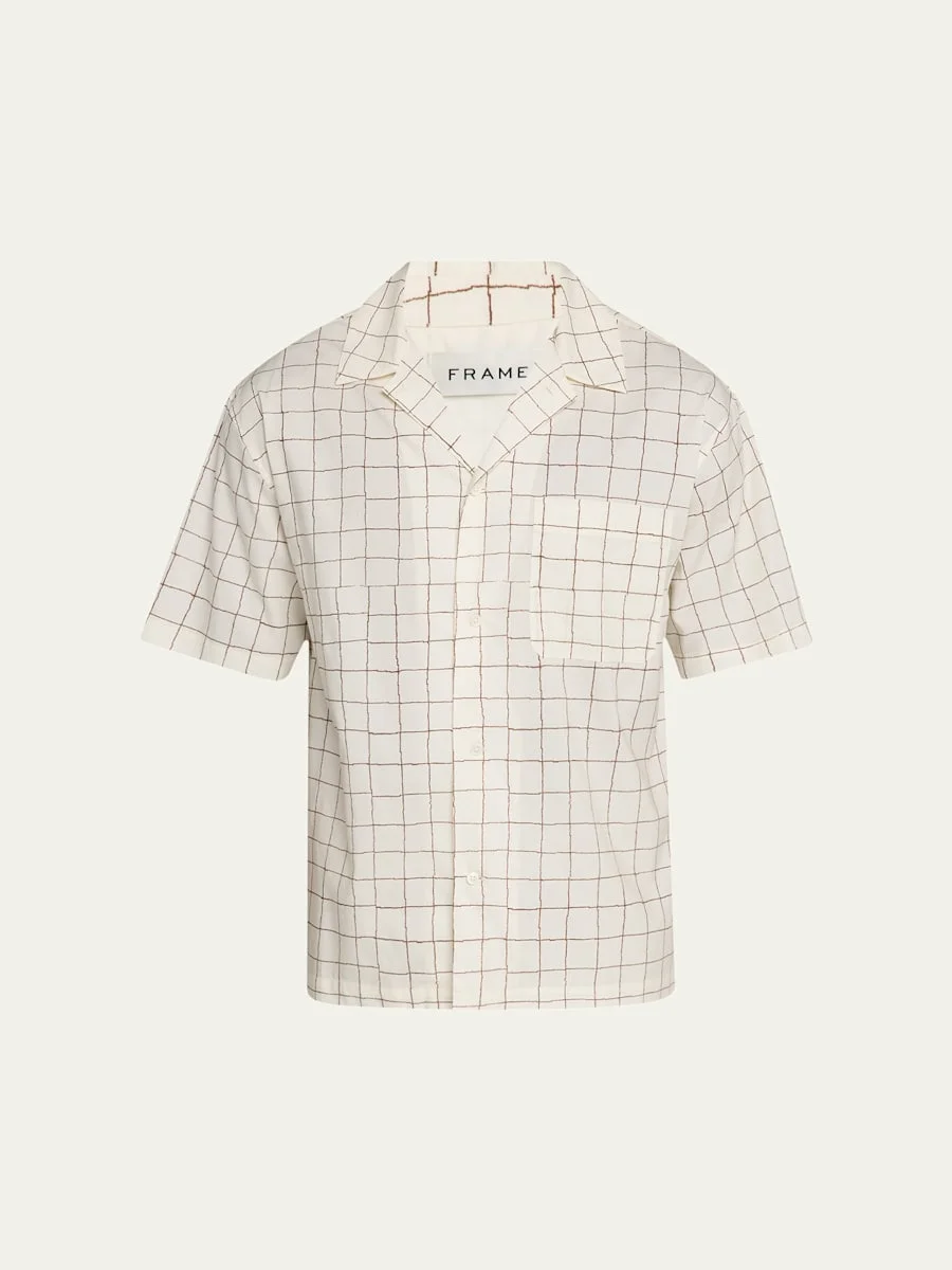 FRAME camp shirt in a vintage wavy grid print Notched collar Button placket Chest patch pocket Short sleeves Regular fit Tencel™ lyocell/cotton Dry clean Imported Online Inquiries: BGS21_ND3MY| Store Inquiries: #5018271