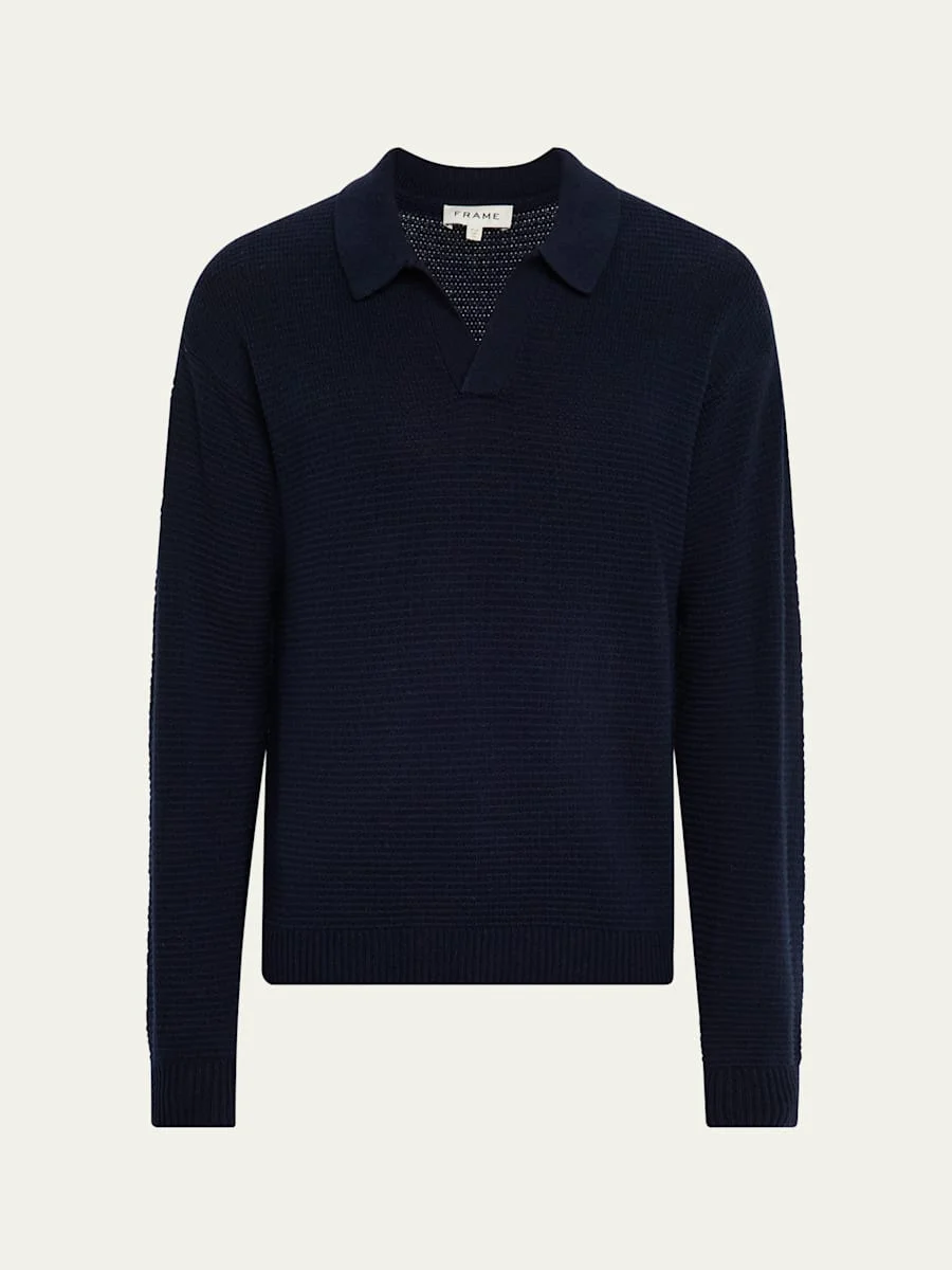 FRAME sweater in a texture knit wool and cashmere blend resulting in a soft handfeel Johnny collar Long sleeves Ribbed cuffs and hem Pullover style Wool/cashmere Dry clean Imported