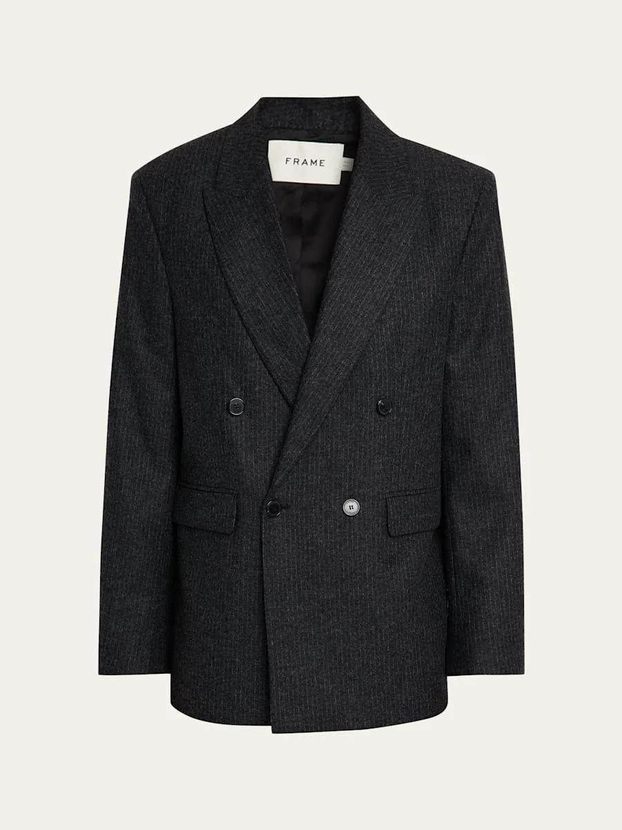 FRAME tailored blazer in a refined wool blend with subtle pinstripes Stand collar Peak lapels Long sleeves Two front flap pockets Relaxed fit Double-breasted closure Wool/nylon/polyamide Dry clean Imported Online Inquiries: BGS21_NDG00| Store Inquiries: #5036821