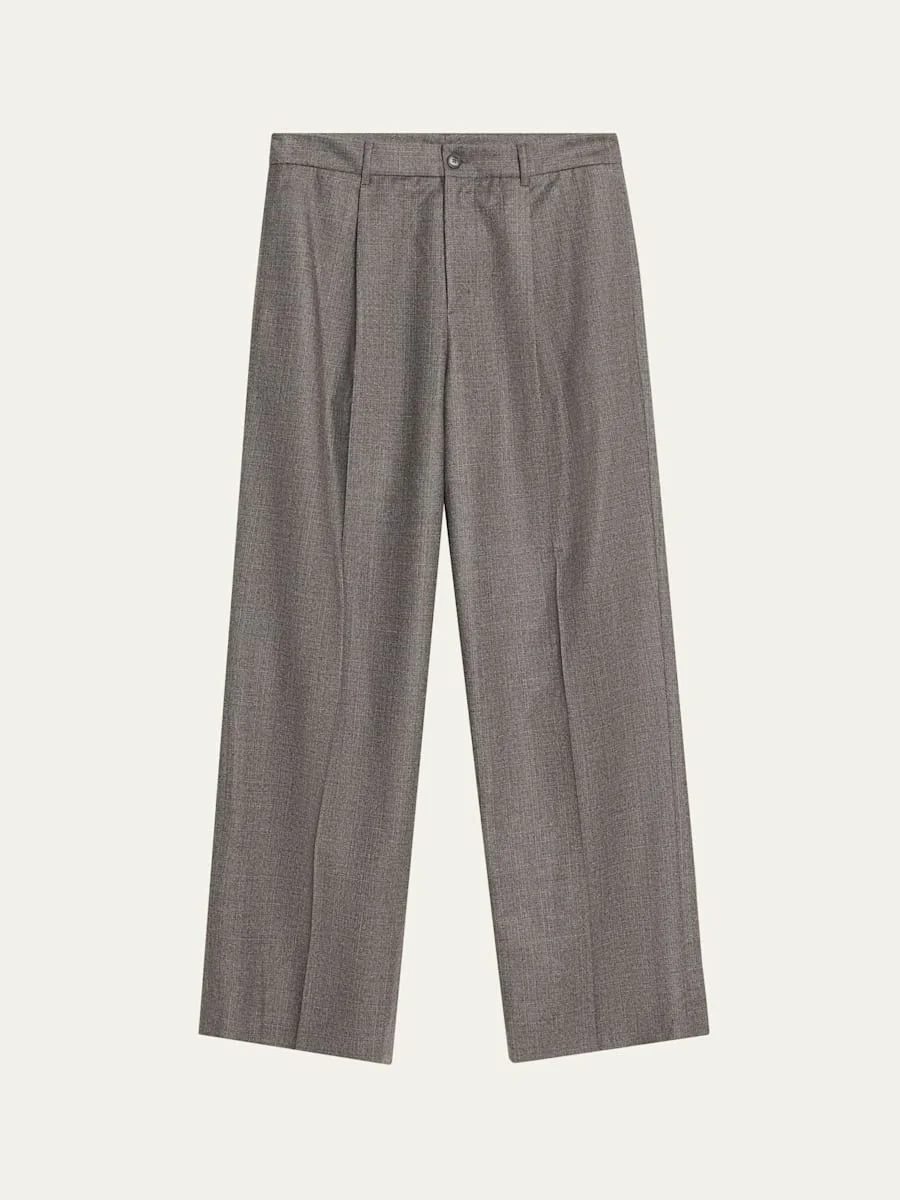 FRAME trousers tailored in a soft wool flannel Approx. 12.5" rise; 32.5" inseam High rise Pleated front Side seam pockets; back welt pockets Wide legs Full length Button/zip fly; belt loops Virgin wool Dry clean only Made in Italy