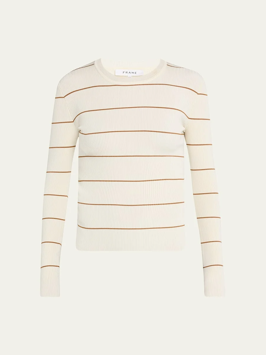 FRAME striped ribbed-knit top Crew neckline Long sleeves Easy fit Hem sits at the hip Pullover style Promodal® rayon Hand wash or dry clean Imported Online Inquiries: BGS21_T64GE| Store Inquiries: #4901188