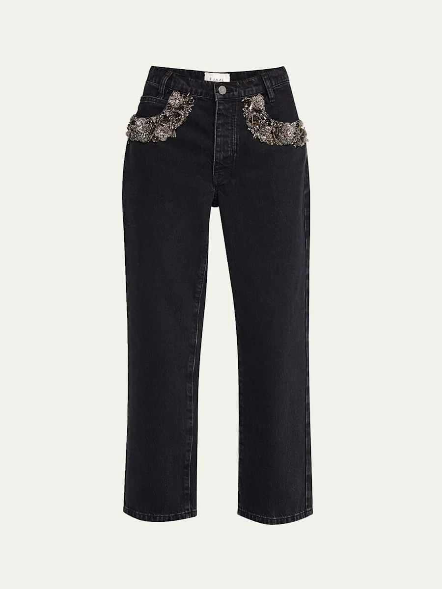 FRAME "The Beaded Straight" jeans in black denim Approx. 27" rise Midrise; sits high on the hip Fivepocket style Straight legs Ankle length Button/zip fly; belt loops Organic cotton Dry clean Imported