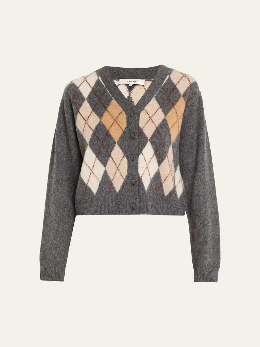 FRAME argyle cardigan crafted from a luxurious merino wool and cashmere blend V neckline Long sleeves Cropped fit Buttonfront Merino wool/cashmere Dry clean only Imported SIZE amp; FITModel measurements: 5'10" tall Model is wearing a US size 4/Small