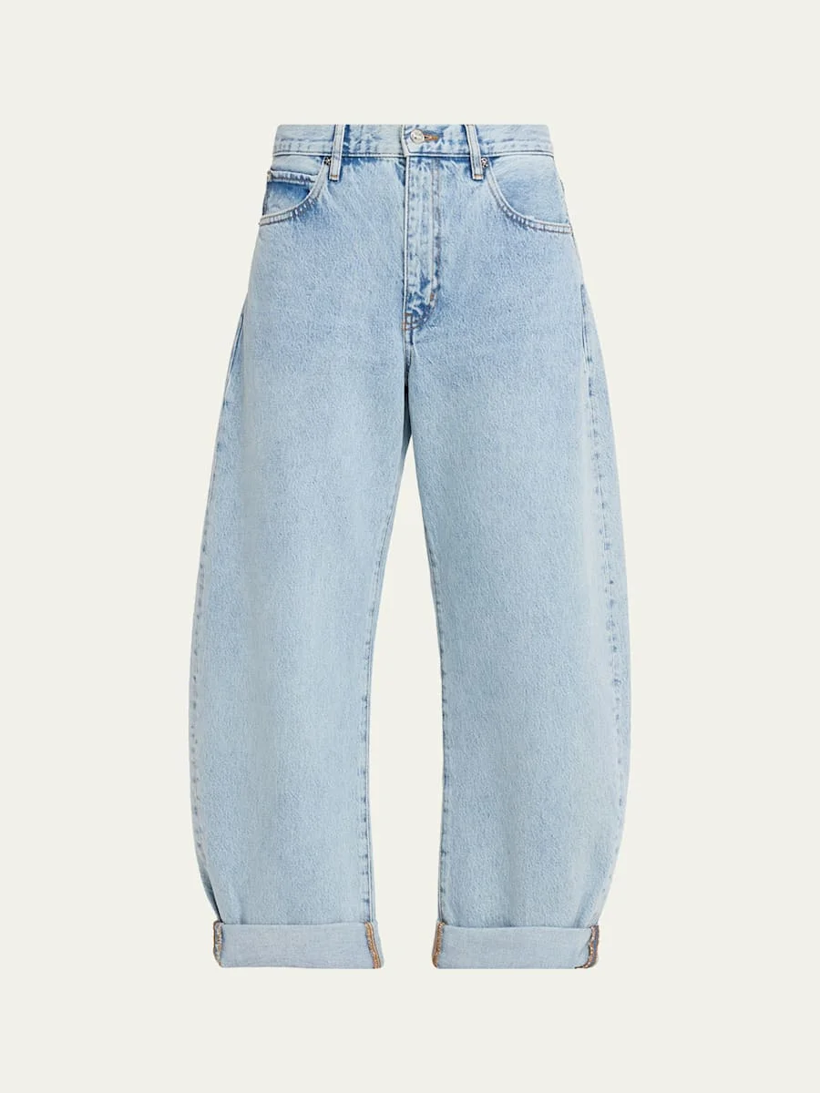 FRAME "The Bubble" jeans in lightwash denim Approx. 12.3" rise High rise Fivepocket style Loose, curved legs Full length Button/zip fly; belt loops Cotton Machine wash cold Imported