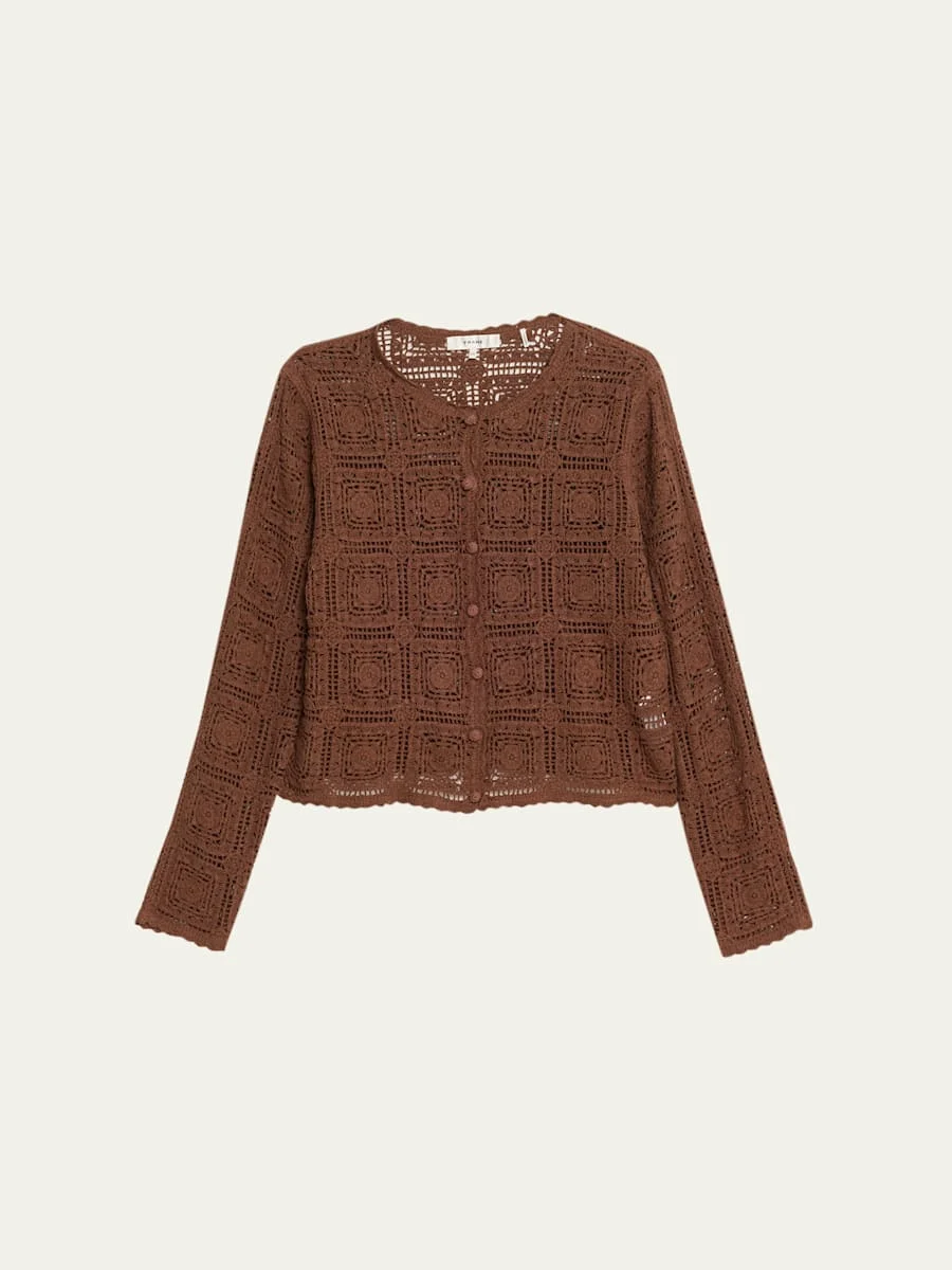 FRAME cotton crochet cardigan Scoop neckline Long sleeves Classic fit Hem sits at the hip Buttonfront Cotton Imported